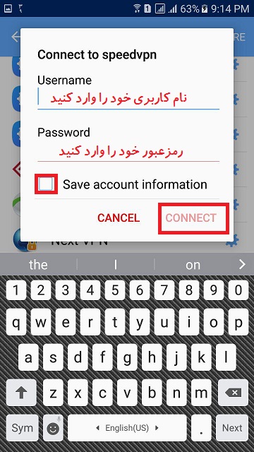 5- روی کانکشن ساخته شده ضربه بزنید نام کاربری و رمز عبور خود را با حرف کوچک وارد کنید و سپس دکمه Connect را بزنید